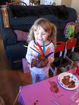 Aubrey loves the little crafts she makes in her preschool. Here she is with her turkey headband.